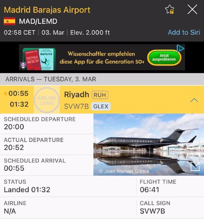 根据飞行追踪器显示,C罗的豪华私人飞机于晚上8点起飞,完成了前往西班牙首都近七个小时的旅程后,于接近凌晨1点抵达马德里。