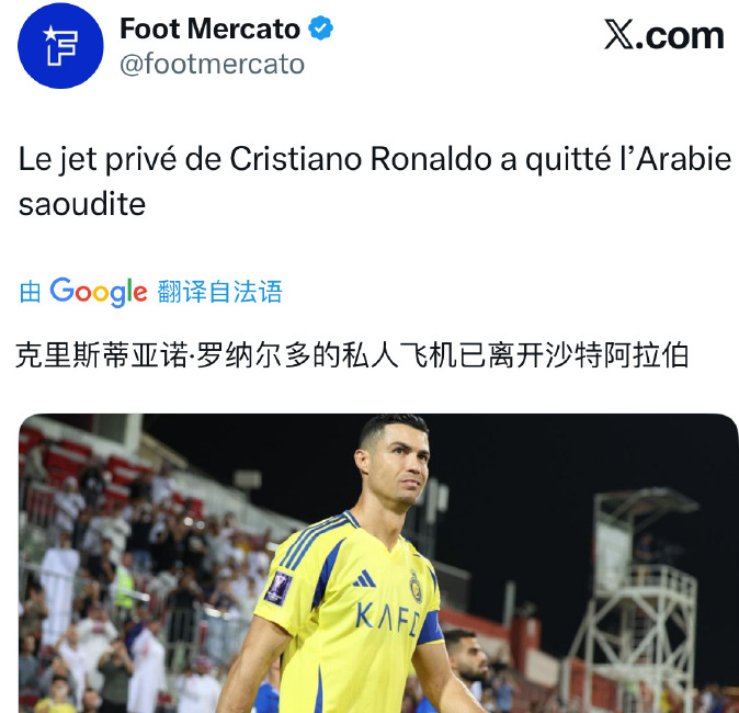 而北京时间3月3日,来自多家外媒的报道,41岁的葡萄牙巨星C罗的私人飞机,已于深夜离开沙特。